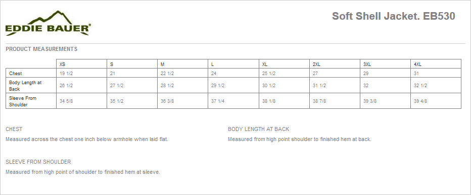 This weather-stopping, three-layer soft shell boasts very good water protection and breathability performance due to its 3K/3K fabric. 3000MM fabric water protection rating, 3000G/M2 fabric breathability rating, component loops at back neck and cuffs for securing to other jackets, reverse coil zippered chest pocket, front zippered pockets, adjustable tab cuffs with hook and loop closures and an open hem with locking drawcord. Contrast Eddie Bauer logo on right chest. Made of 96/4 poly/spandex.